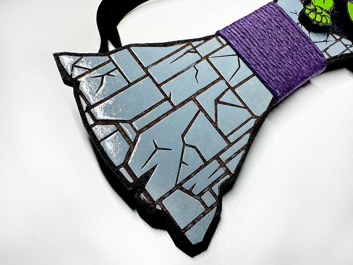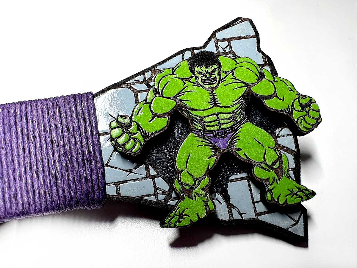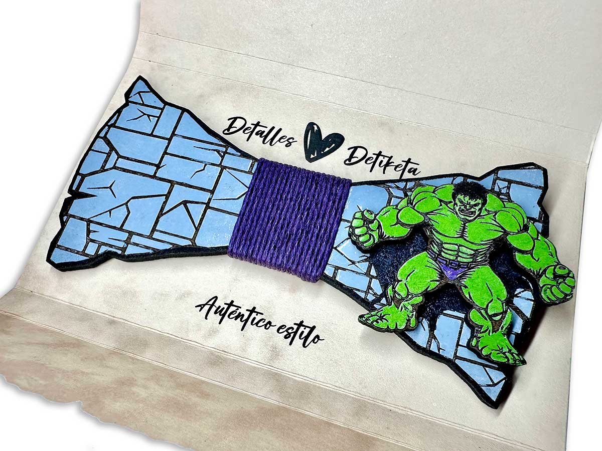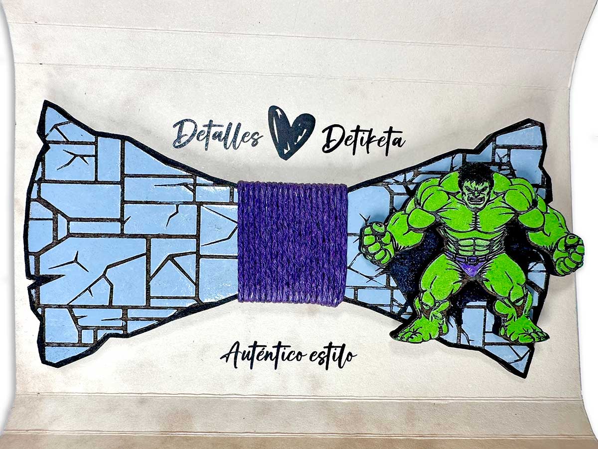 Nuestra pajarita de madera inspirada en Hulk no es solo un complemento: es una explosión de carácter, energía y actitud superheroica. Su diseño representa una pared de piedras de la que emerge el superhéroe en relieve, transmitiendo fuerza, movimiento y un estilo imparable que no pasa desapercibido.
