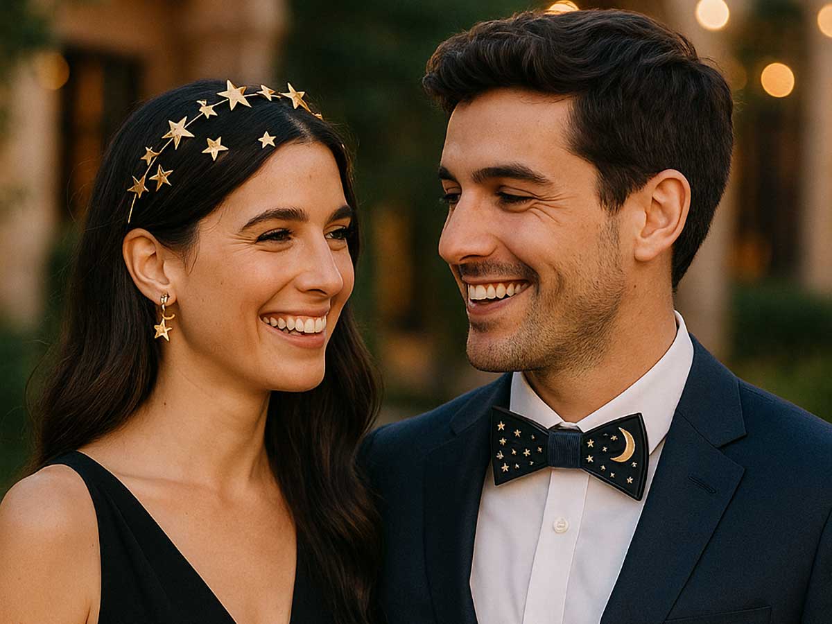 Esta pieza, por ejemplo, fue creada para un invitado con un dresscode muy especial: “noche estrellada”. Nos compartió su visión y nos pusimos manos a la obra. El resultado fue una pajarita tan única como la velada, hecha para brillar con estilo propio.
